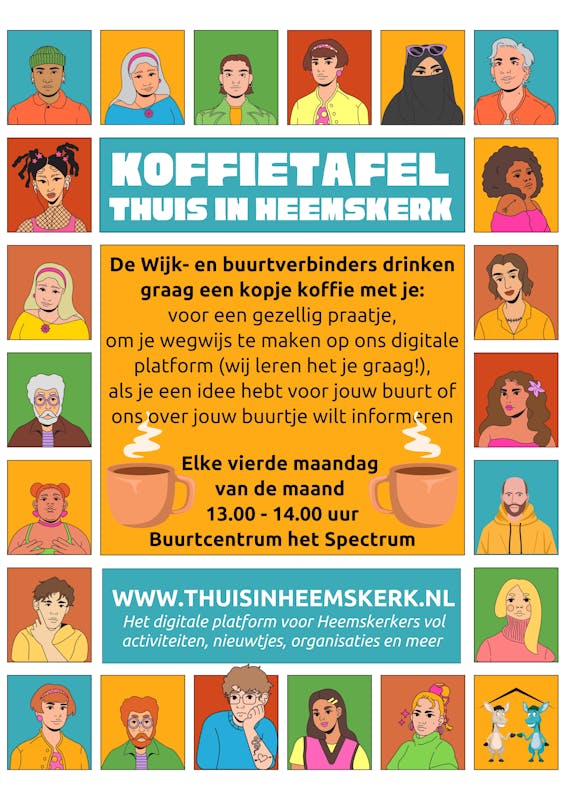 Wil je meer weten over het digitale platform 'Thuis in Heemskerk'; Hoe het werkt, hoe je een profiel aanmaakt en een bericht plaatst, wat je erop kan vinden, kom dan gezellig op de koffie. Buurt- en wijkverbinder maken graag een praatje met je en nemen de tijd om je wegwijs te maken op het platform.
