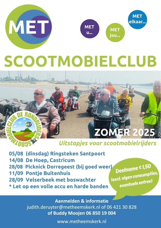 Regelmatig gaan de deelnemers van Scootmobielclub de Rondrijders met elkaar op stap. In een rustig tempo rijden we naar een leuke bestemming om een kopje koffie met wat lekkers te gebruiken of een heerlijke lunch. Een groep enthousiaste vrijwilligers leidt de tocht in goede banen. Deelnemen kan door je aan te melden bij judith.deruyter@metheemskerk of Buddy (06 850 19 004). De kosten voor deelname bedragen € 1,50 en houd rekening met de kosten van consumpties op de bestemming. De scootmobielrit begint en eindigt altijd bij Buurtcentrum het Spectrum.