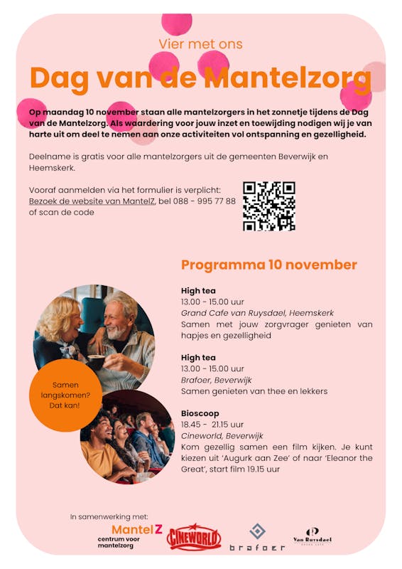 Op 10 november zetten we de mantelzorgers in het zonnetje tijdens de Dag van de Mantelzorg. Als waardering voor de inzet en toewijding nodigen we de mantelzorgers uit voor een bioscoopbezoek. De deelname is gratis voor mantelzorgers uit Heemskerk en Beverwijk.