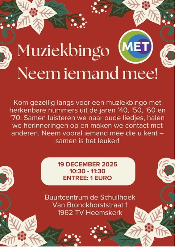 Voor meer informatie kunt u contact opnemen met Ingrid Dudink: 06-48457632. Deze activiteit is bedacht door studente Anna en wordt uitgevoerd door medewerkers en vrijwilligers van MET Heemskerk.