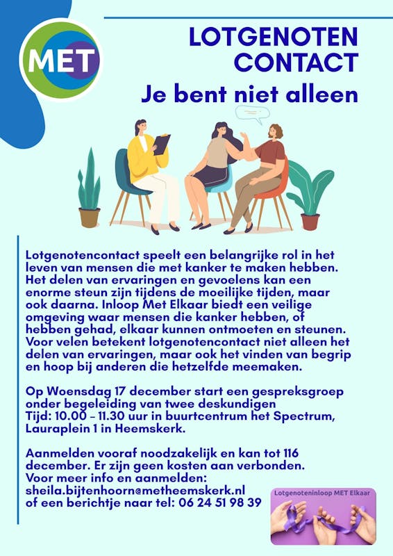 Inloop Met Elkaar biedt een veilige omgeving waar mensen die kanker hebben, of hebben gehad, elkaar kunnen ontmoeten en steunen. Voor velen betekent lotgenotencontact niet alleen het delen van ervaringen, maar ook het vinden van begrip en hoop bij anderen die hetzelfde meemaken. Op 17 december bieden wij, onder deskundige begeleiding, een gespreksgroep om ervaringen uit te wisselen.
