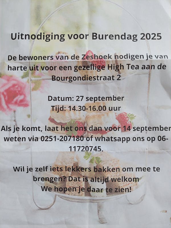 Voor de bewoners van Zuidbroek, wordt er in de zeshoek (op de bourgondiestraat 2) een gezellige high tea georganiseerd voor alle buurtbewoners. Komt u ook?
