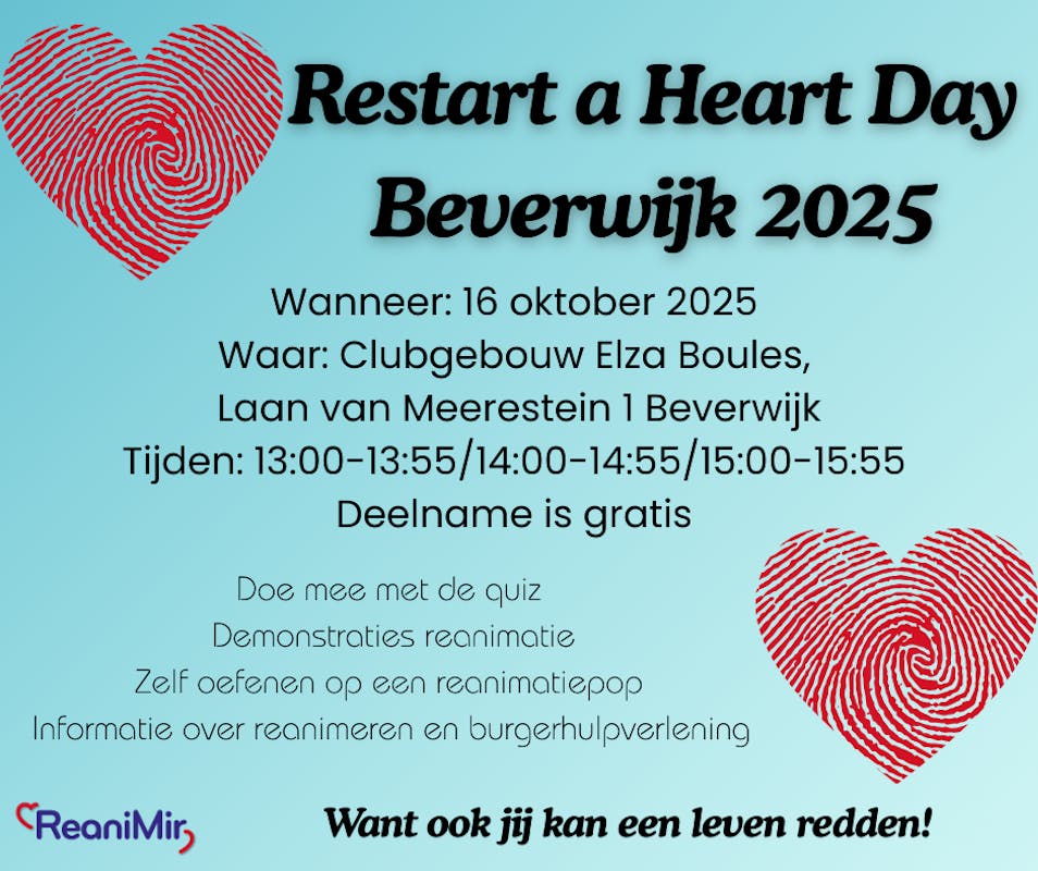 Op 16 oktober organiseren we, 'Restart a Heart Day Beverwijk 2025'. Het doel van deze dag is om zoveel mogelijk mensen kennis te laten maken met reanimatie door omstanders.