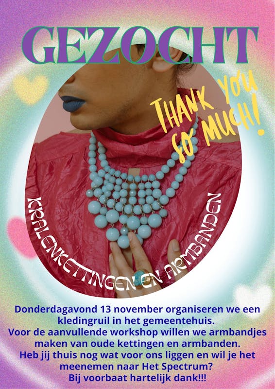 Donderdagavond 13 november organiseren Kledingloop Heemskerk, de Bibliotheek en Thuis in Heemskerk een kledingruilavond op het gemeentehuis. Deze avond zijn er ook twee leuke workshops: Kleuradvies en armbandjes maken van oude kralenkettingen en armbanden. Voor de laatste workshop zamelen we kralenkettingen en armbanden in, zodat er 13 november voldoende keuze is. Heb jij nog kralenkettingen en armbanden die je niet meer draagt? Wij zijn er heel erg blij mee! Alles kan worden afgegeven in Wijkcentrum het Spectrum. Bij voorbaat hartelijk dank!