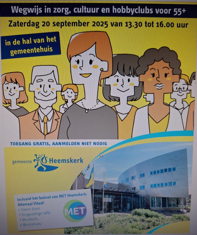 MET Heemskerk organiseert ook “Allemaal Vitaal” speciaal voor alle 55-plussers. Wil je je vitaal voelen en genieten van elk moment, zelfs als de tijden moeilijk zijn? Bezoek het evenement in de raadzaal! Proef een heerlijke mocktail, laat jezelf gaan tijdens de silent disco en heb plezier aan de vrijgezellige tafel.