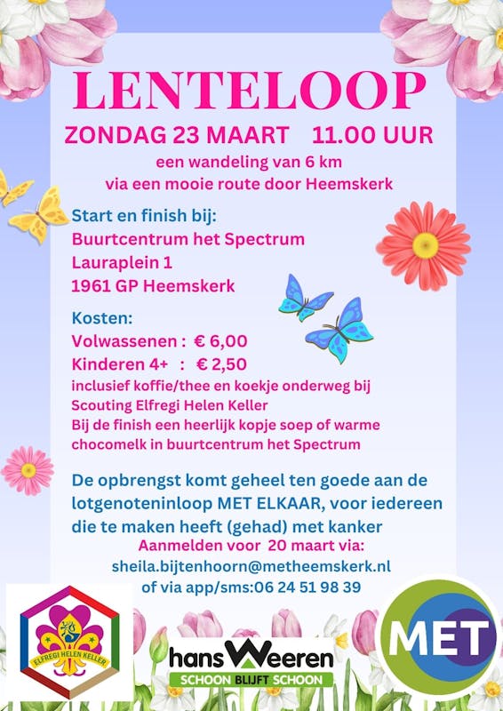 Op zondag 23 maart organiseert de inloop MET Elkaar de LENTELOOP. Een sponsorwandeling voor jong en oud. via een mooie route door Heemskerk De totale opbrengst komt ten goede aan activiteiten voor de gasten van de inloop. Onderweg is er een mogelijkheid voor een pauze bij scouting Elfregi Helen Keller met koffie//thee en een koekje. Bij terugkomst in het Spectrum kunt u genieten van een lekkere verse kom soep of warme chocolademelk. Met dank aan schoonmaakbedrijf Hans Weeren voor de sponsoring.