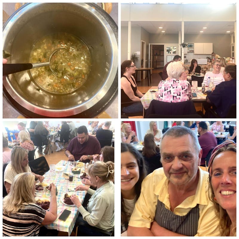 Het was weer smullen gisteravond in het wijkpunt. Onze kok Paul en zijn koksmaatje Margarita hebben weer heel hard gewerkt om voor 25 mensen een drie gangen maaltijd te verzorgen. De 9 liter pan verse groentesoep vooraf (met stokbrood) was bijna schoon leeg. Hoofdgerecht was rode kool met appelmoes met een heerlijke homemade gehaktbal, jus en gekookte aardappeltjes. Ter afsluiting nog een toetje toe. Paul had ook nog voor iedereen een heerlijk geurend aardigheidje om mee naar huis te nemen. De sfeer was top en de afwas wederom groot, maar met zo’n geslaagde avond doen we dat fluitend ( met dank ook aan de aanwezige collega’) De Volgende Meet & eat staat gepland op 28 mei. Meer info over het inschrijven volgt binnenkort. (Kan nu nog niet!)