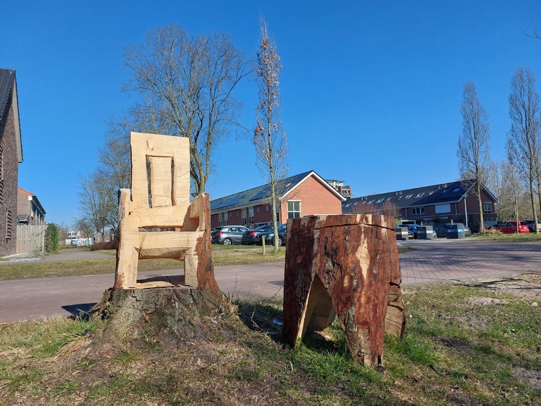 Sinds kort kunt u koninklijk zitten in het plantsoen bij de Coornhertstraat, een aantal bomen zijn verzaagd tot prachtige zetels en sommige zelfs met bijpassend tafeltje. Leuk om eens uit te proberen of het ook lekker zit of om een mooi staatsieportret te maken, nog leuker als u de foto's ook deelt op Thuis in Heemskerk!