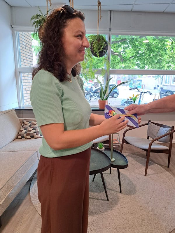 Mevrouw zei dat zoiets haar nooit overkomt dus ze was erg blij! En voor ons is het altijd leuk om iemand te verrassen!