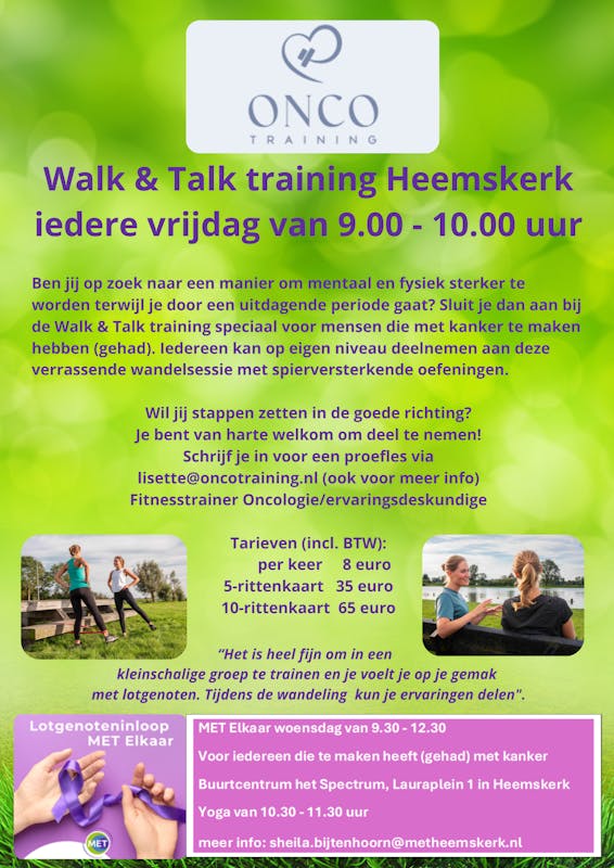 Onlangs een fijn gesprek gehad met Lisette Jonker. Zij is oncologisch fysiotherapeute en ervaringsdeskundige. Op onze vorige locatie gaf zij Walk en talk trainingen en zij wil dit graag voortzetten. Wij zijn super blij dat we hiermee het aanbod van de inloop weer kunnen uitbreiden. Meer info is te lezen op de flyer (zie foto).